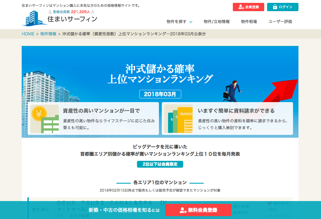 会員登録(無料)するだけで、検討物件の儲かる確率、新築マンション時価の指標などが確認できます。購入前に是非チェックしてみてはどうでしょうか?
